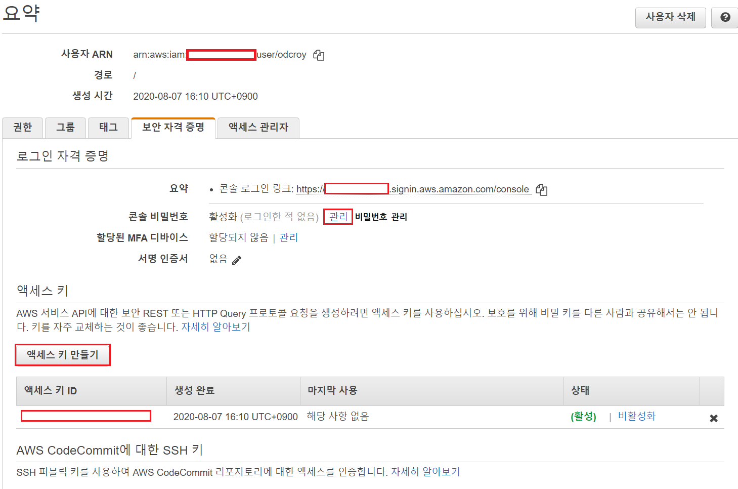 루트 사용자로 접속한 후 IAM-사용자(변경할 사용자)-보안 자격 증명 탭으로 가면 해당 사용자에 대한 정보를 변경할 수 있다.